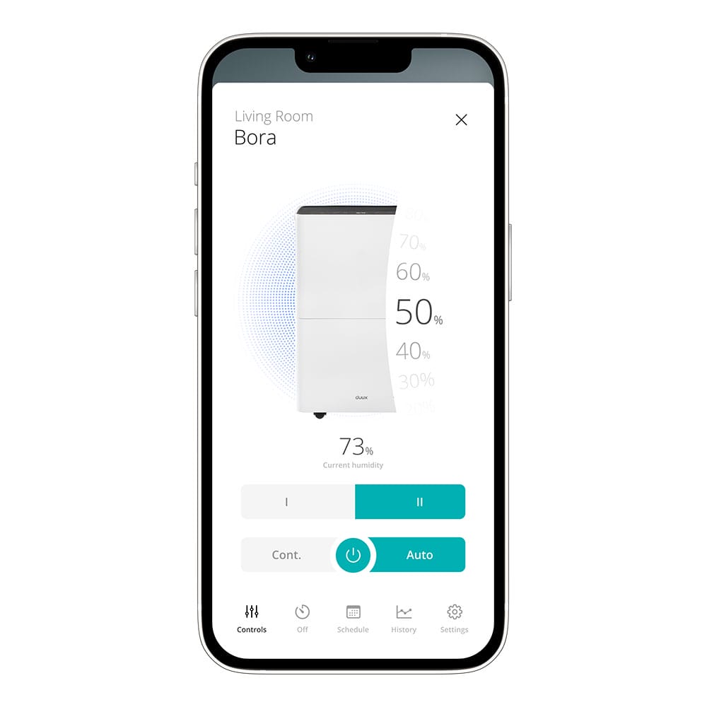 Simply download the Duux Smart app to stay on top of your indoor climate anytime, anywhere. Or, control using the clear LED operating panel. The invisible display shows the current humidity level, and with the timer mode, you can set Bora to automatically switch off anywhere between 1 to 24 hours.