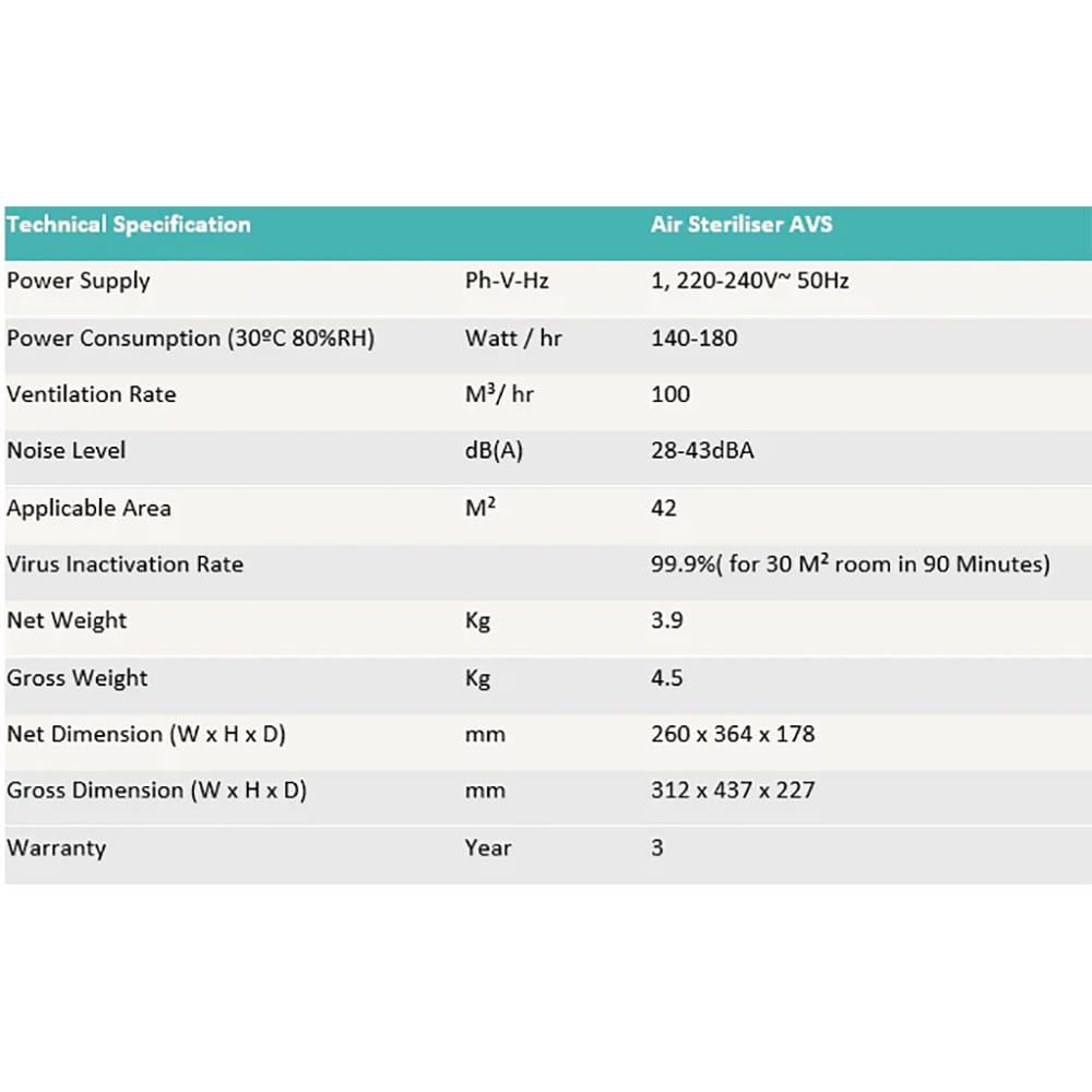 - Virus Inactivation Rate – 99.99%(for 30 m2 room in 90 minutes)
