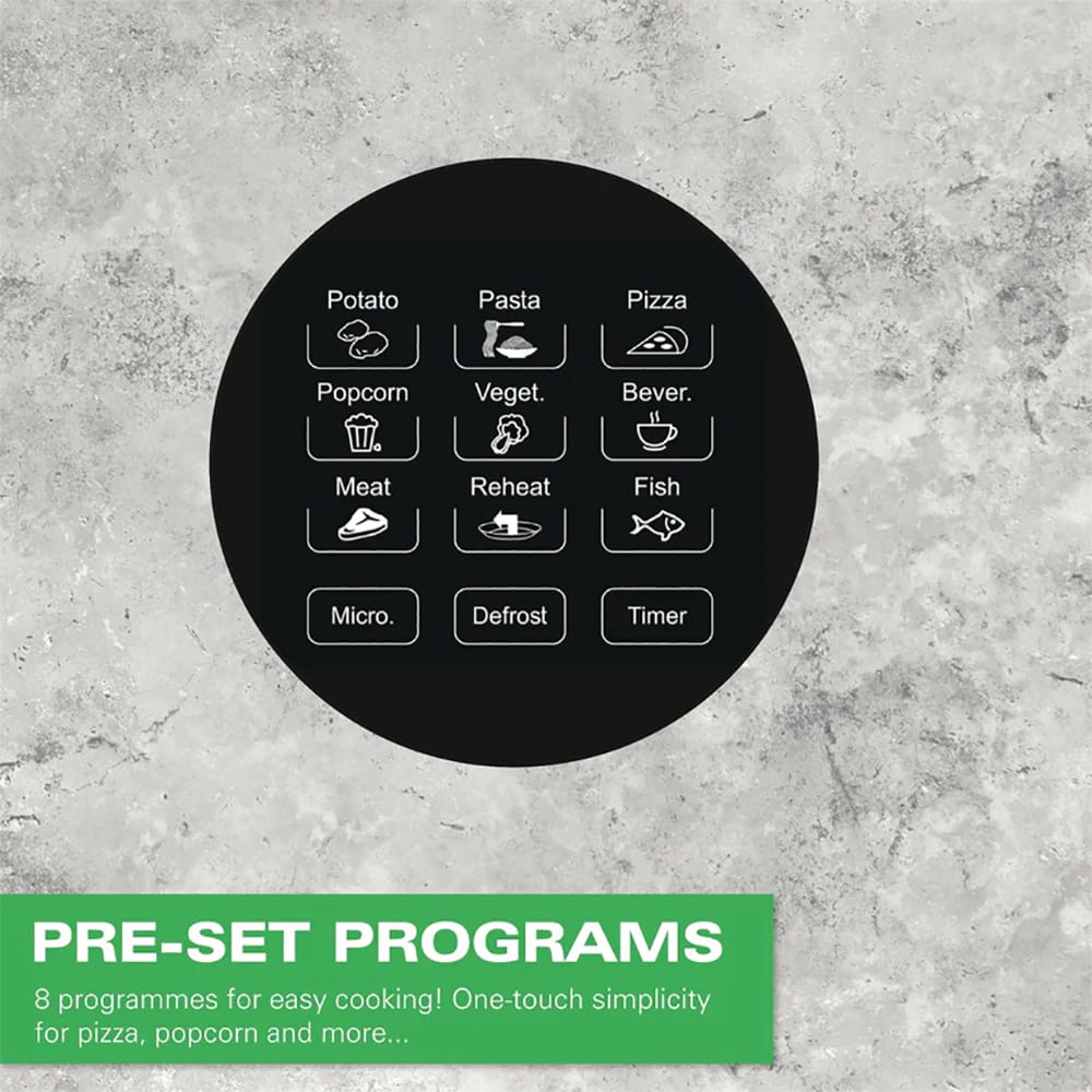 • Customised Options: Customise your cooking with 10 power levels to tailor the microwave to your cooking needs. Choose from 8 Presets: Potato, Pasta, Pizza, Popcorn, Vegetables, Beverage, Meat and Fish to customise your microwave to the food you wish to cook.