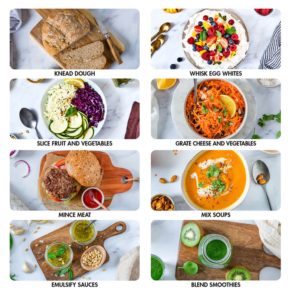 - Includes everything you’ll need to slice, grate, chop, whisk, blend and knead
