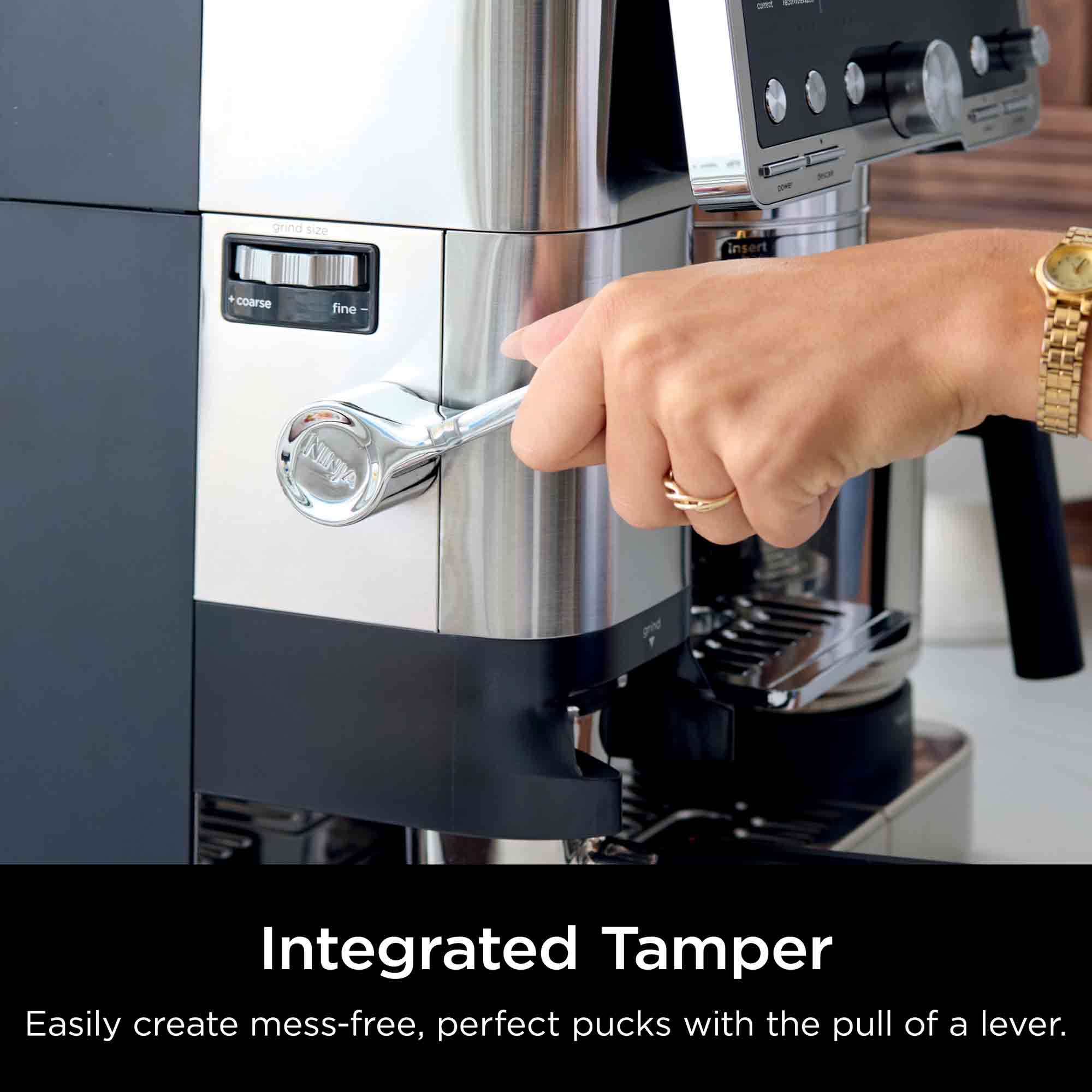 - Integrated tamper: Easily create perfect pucks with the pull of a lever.